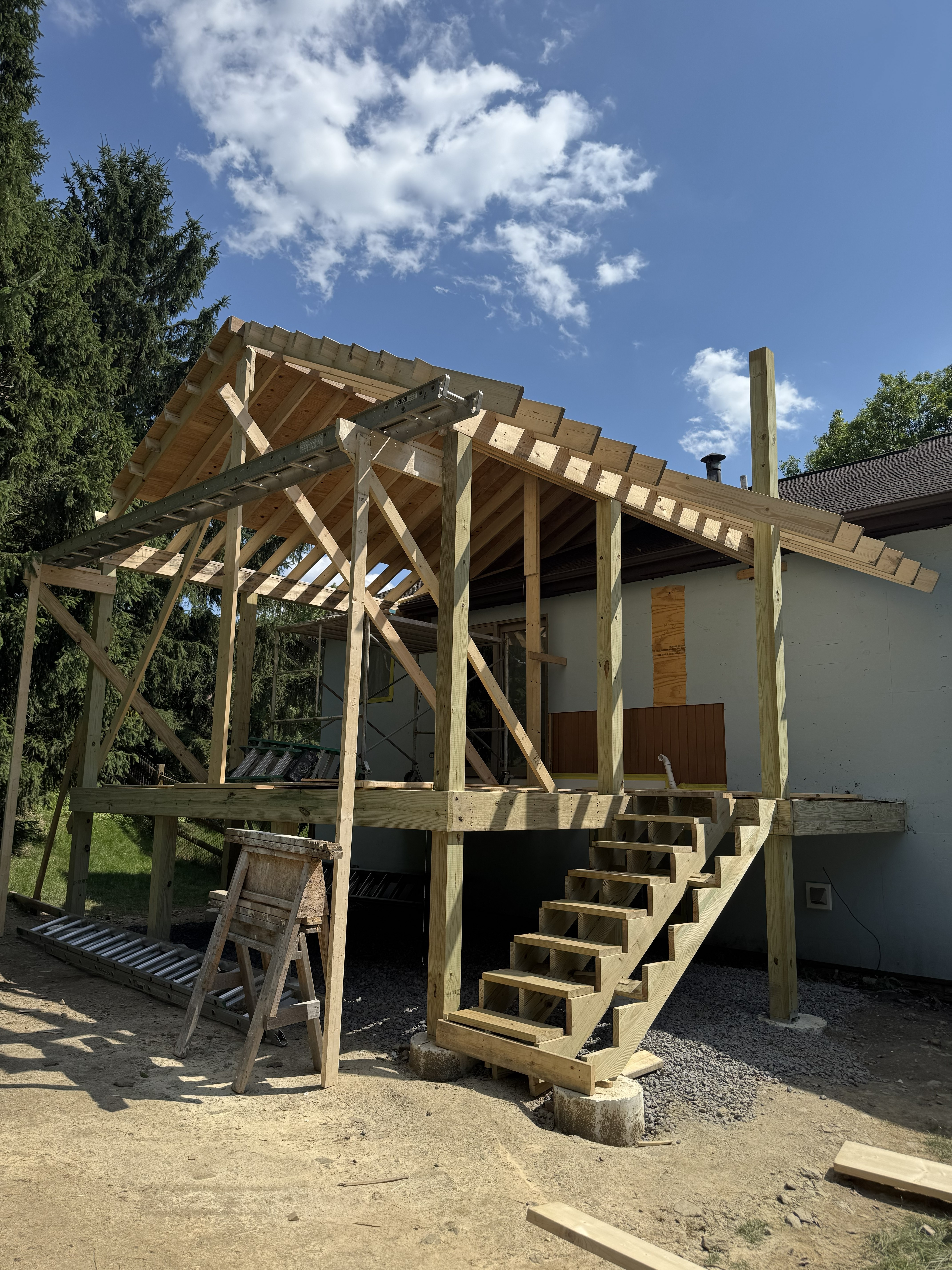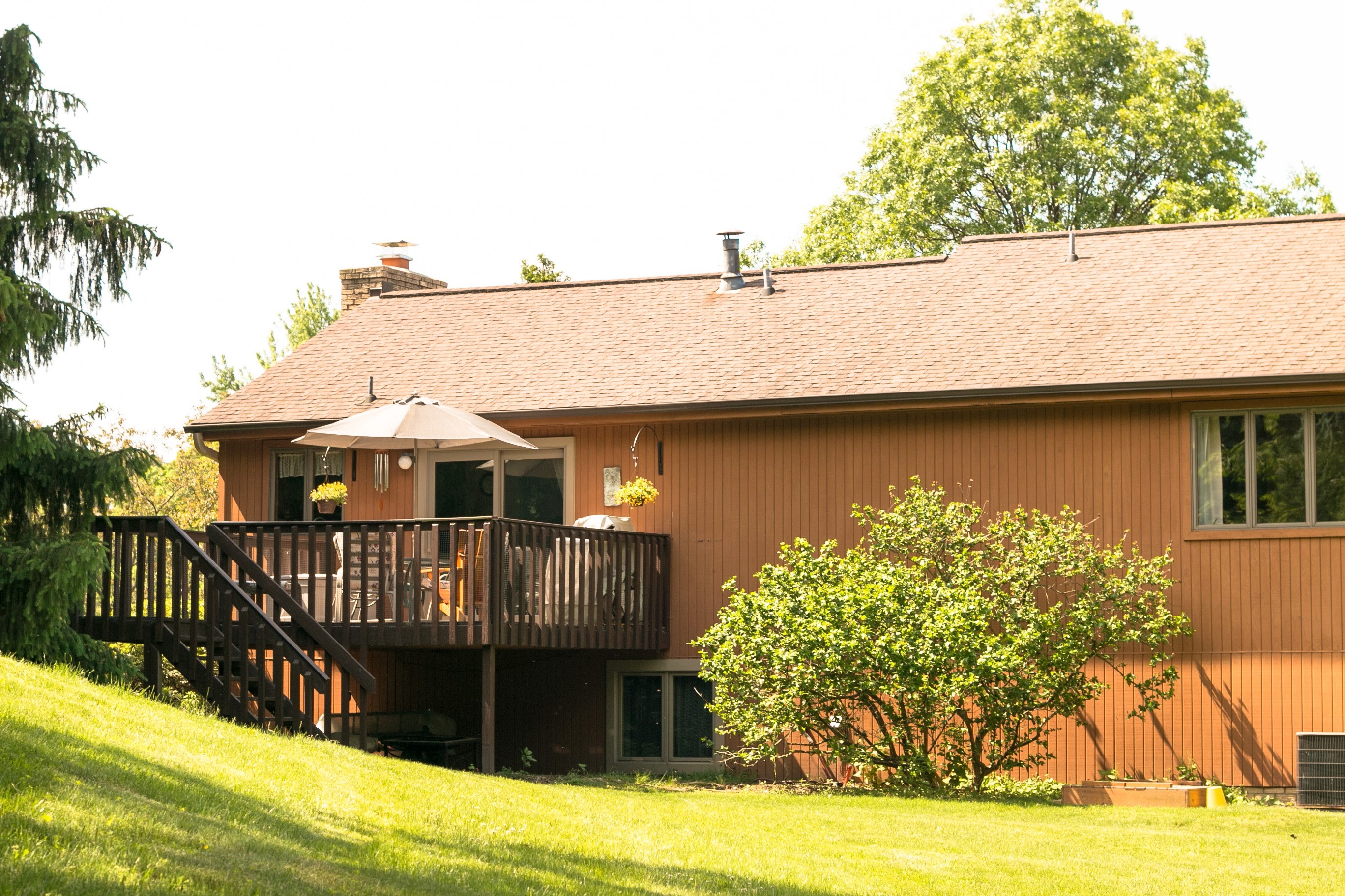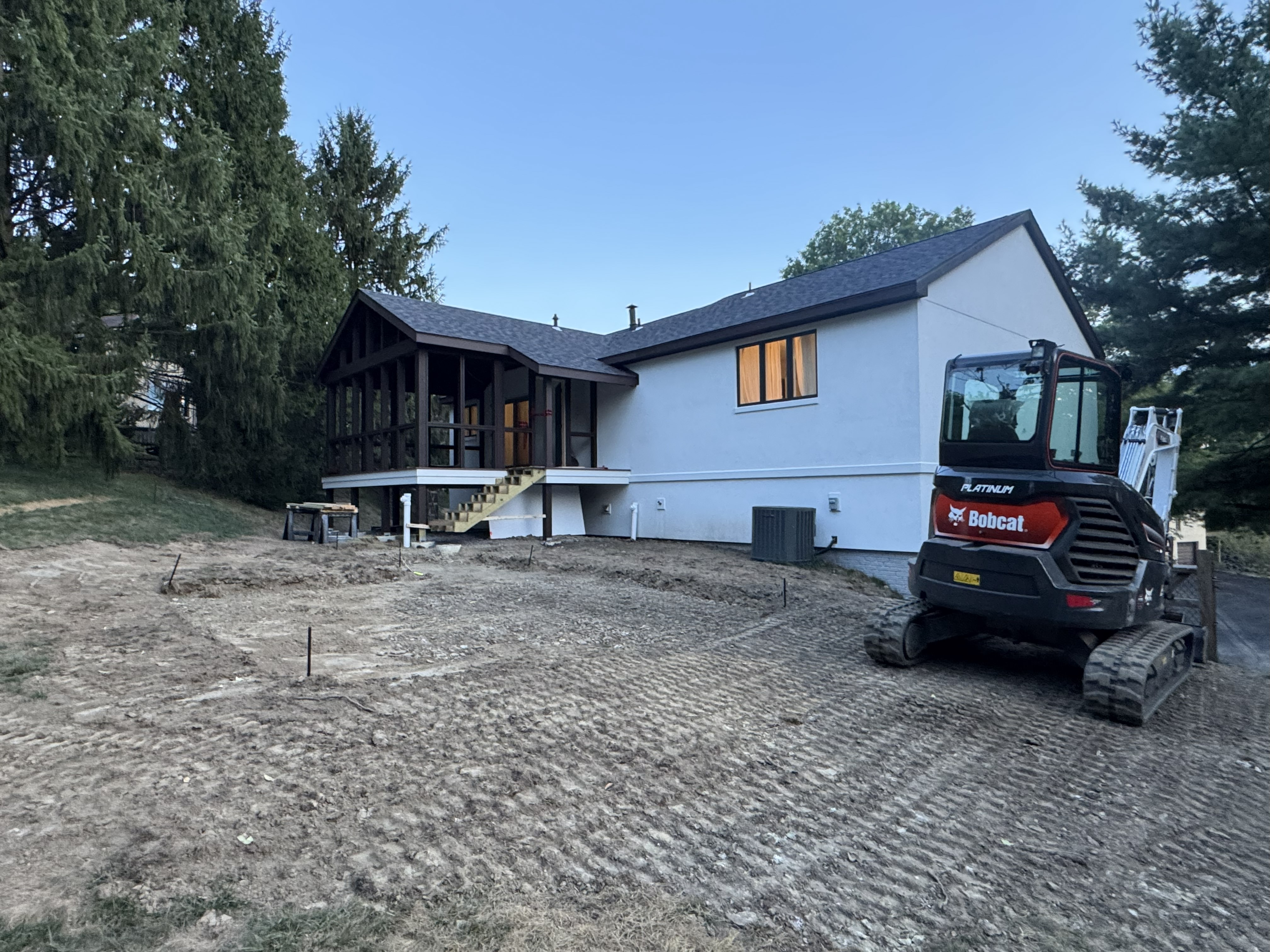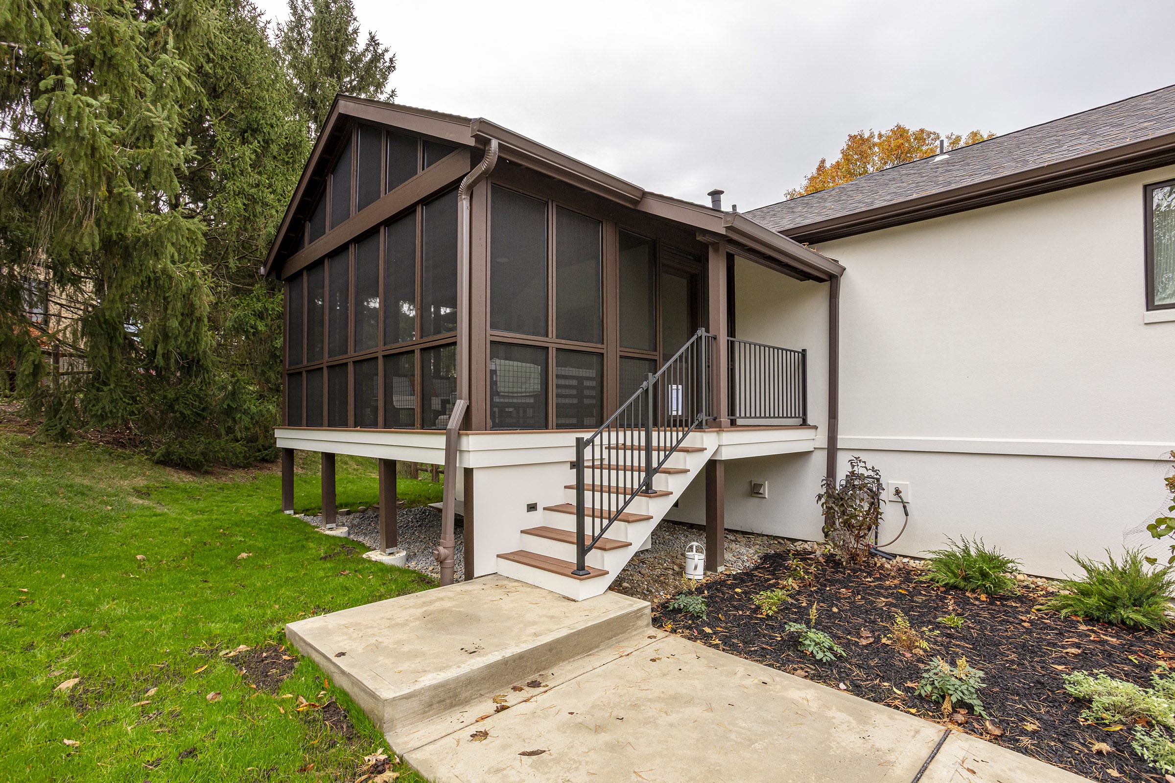 This exterior renovation in Fox Chapel showcases a transformation through coordination of construction and landscape improvements. The home received a refreshing new paint palette, updated front entry stairs, a rebuilt retaining wall, all new windows, a new roof, and a new front door. On the rear elevation, our team removed the existing deck and reconstructed the structure to create a screened in living space. The renovation is complete with a new concrete patio and landscaping elevating the curb appeal.