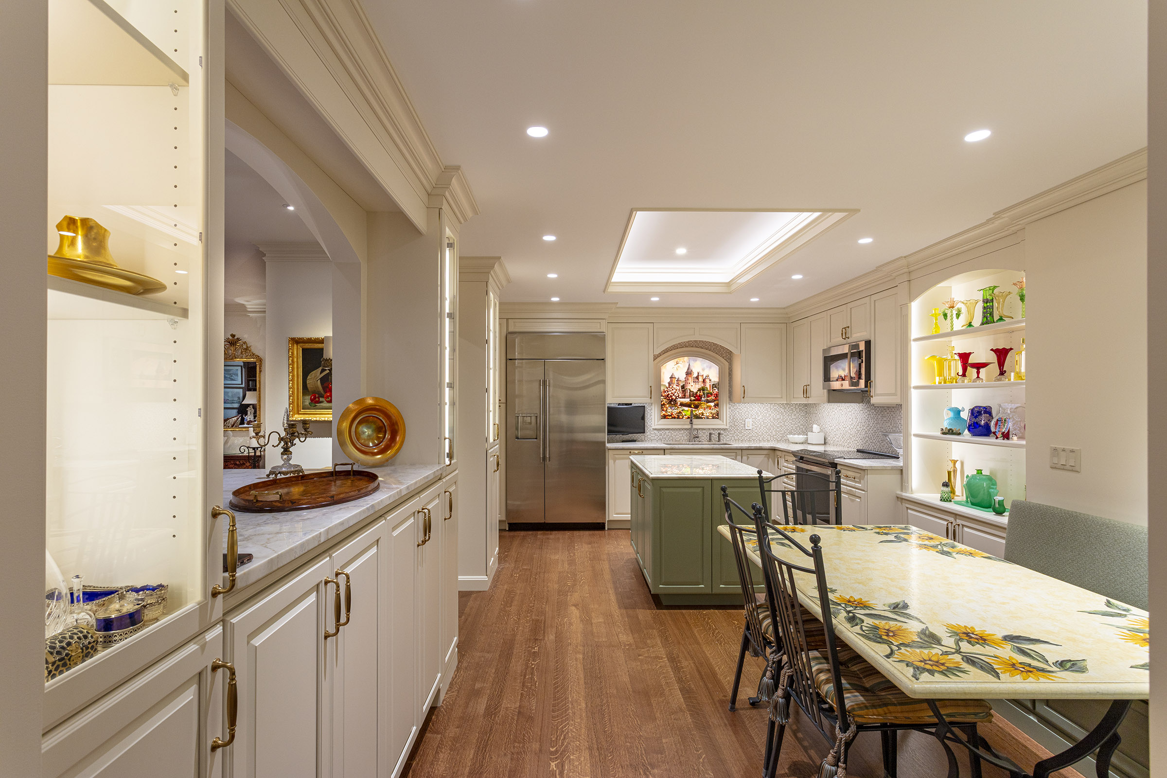 A complete home renovation for a relocating family: enlarged master bathroom, custom kitchen, redesigned children’s bath, refreshed dining area, and updated third-floor retreat.