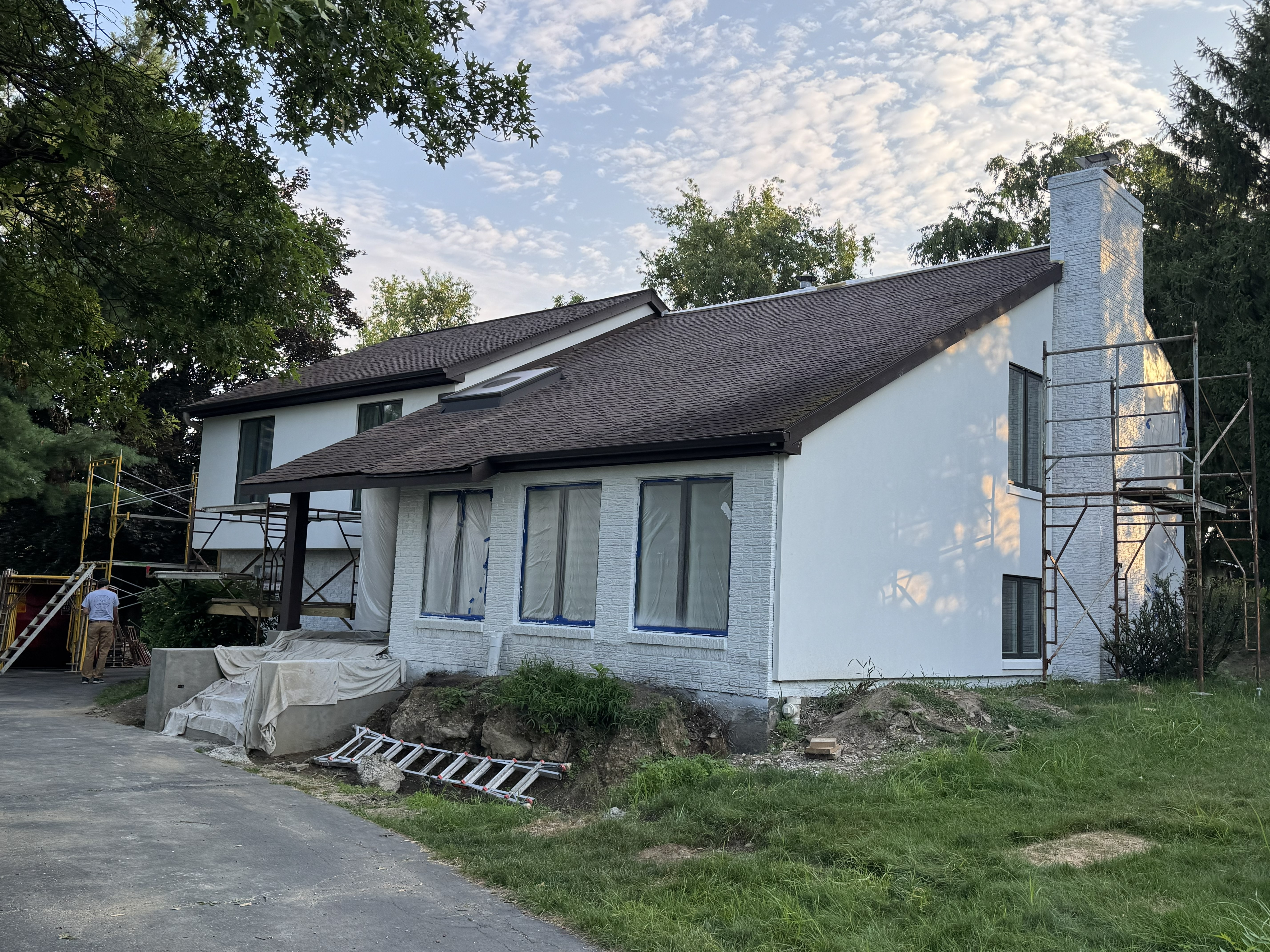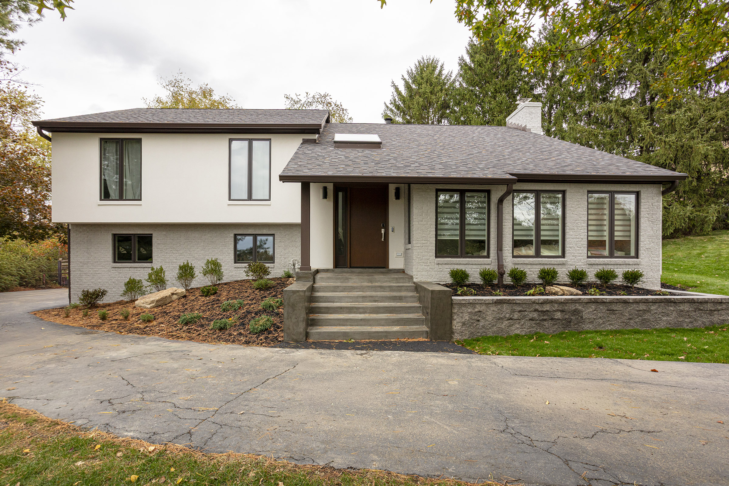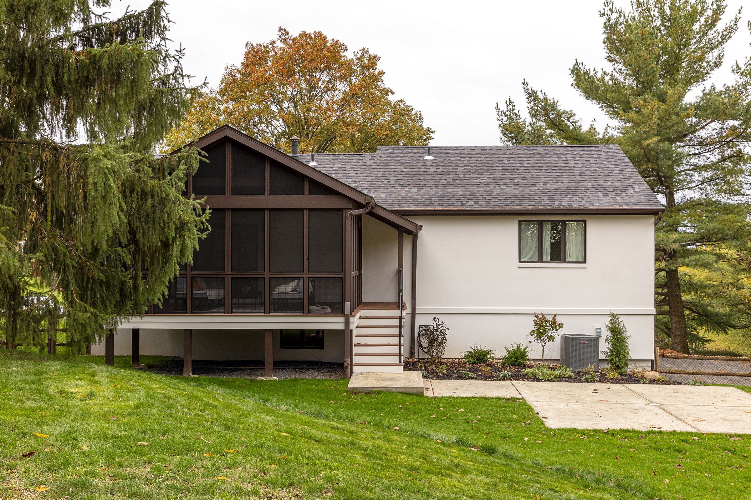 This exterior renovation in Fox Chapel showcases a transformation through coordination of construction and landscape improvements. The home received a refreshing new paint palette, updated front entry stairs, a rebuilt retaining wall, all new windows, a new roof, and a new front door. On the rear elevation, our team removed the existing deck and reconstructed the structure to create a screened in living space. The renovation is complete with a new concrete patio and landscaping elevating the curb appeal.